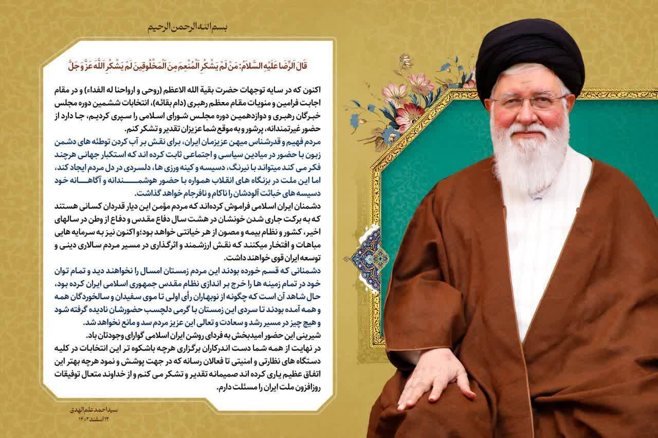 اکنون که در سایه توجهات حضرت بقیة الله الاعظم (روحی و ارواحنا له الفداء) و در مقام اجابت فرامین و منویات مقام معظم رهبری (دام بقائه)، انتخابات ششمین دوره مجلس خبرگان رهبری و دوازدهمین دوره مجلس شورای اسلامی را سپری کردیم، جا دارد از حضور غیرتمندانه، پرشور و به موقع شما عزیزان تقدیر و تشکر کنم.