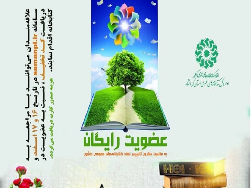 مدیرکل کتابخانههای عمومی استان کرمانشاه تصریح کرد: به مناسبت بیستمین سالروز تأسیس نهاد کتابخانه های عمومی علاقمندان به کتاب و کتابخوانی میتوانند از طریق سایت samanpl.ir و یا به صورت حضوری به کتابخانه عمومی محل خود مراجعه کنند و کد عضویت رایگان را دریافت نمایند و برای یکسال تمام عضو کتابخانه عمومی باشند و از منابع آن بهرمند شوند.